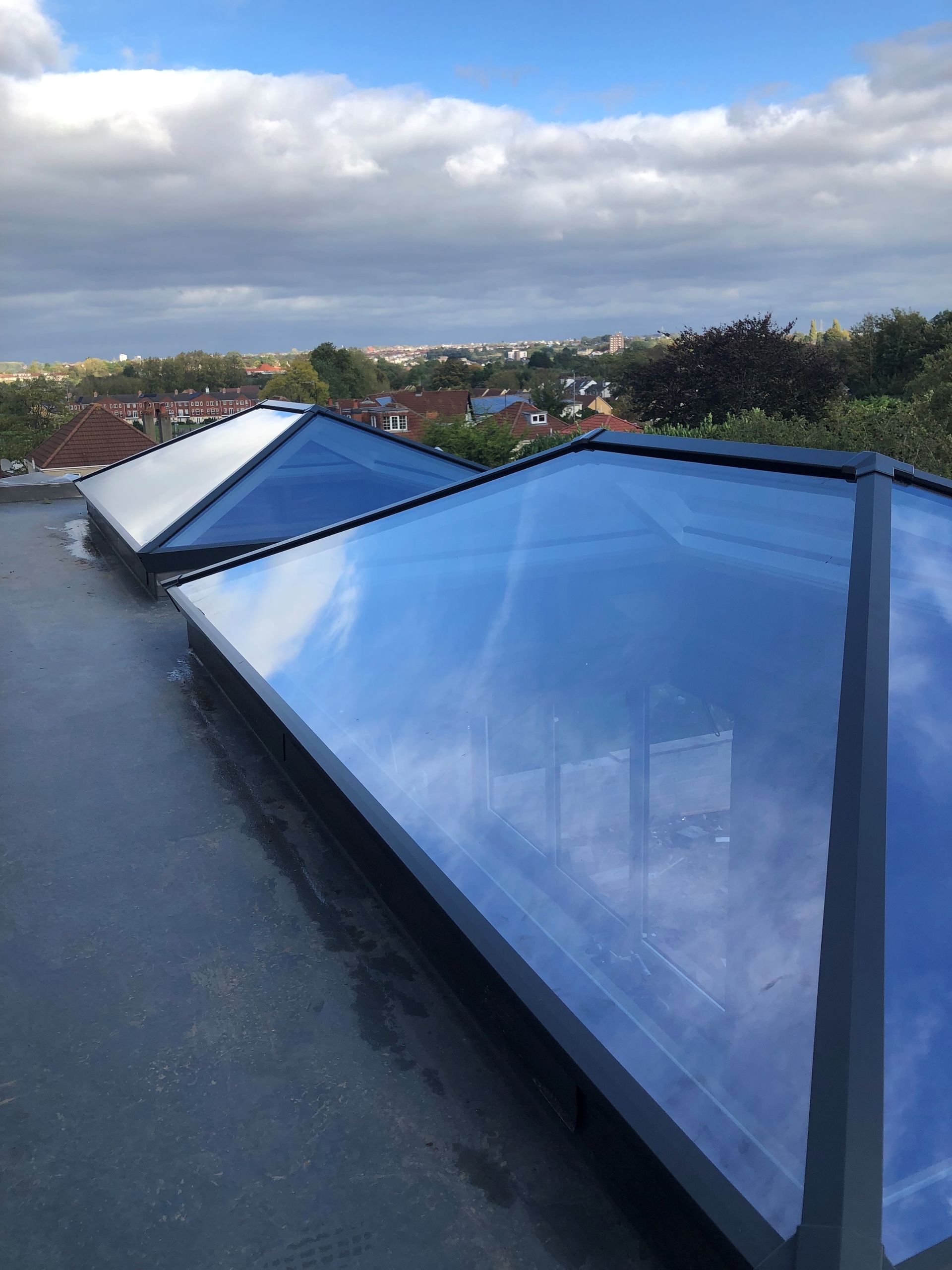 These multi-pane flat roofs are the best option for natural light in larger areas.